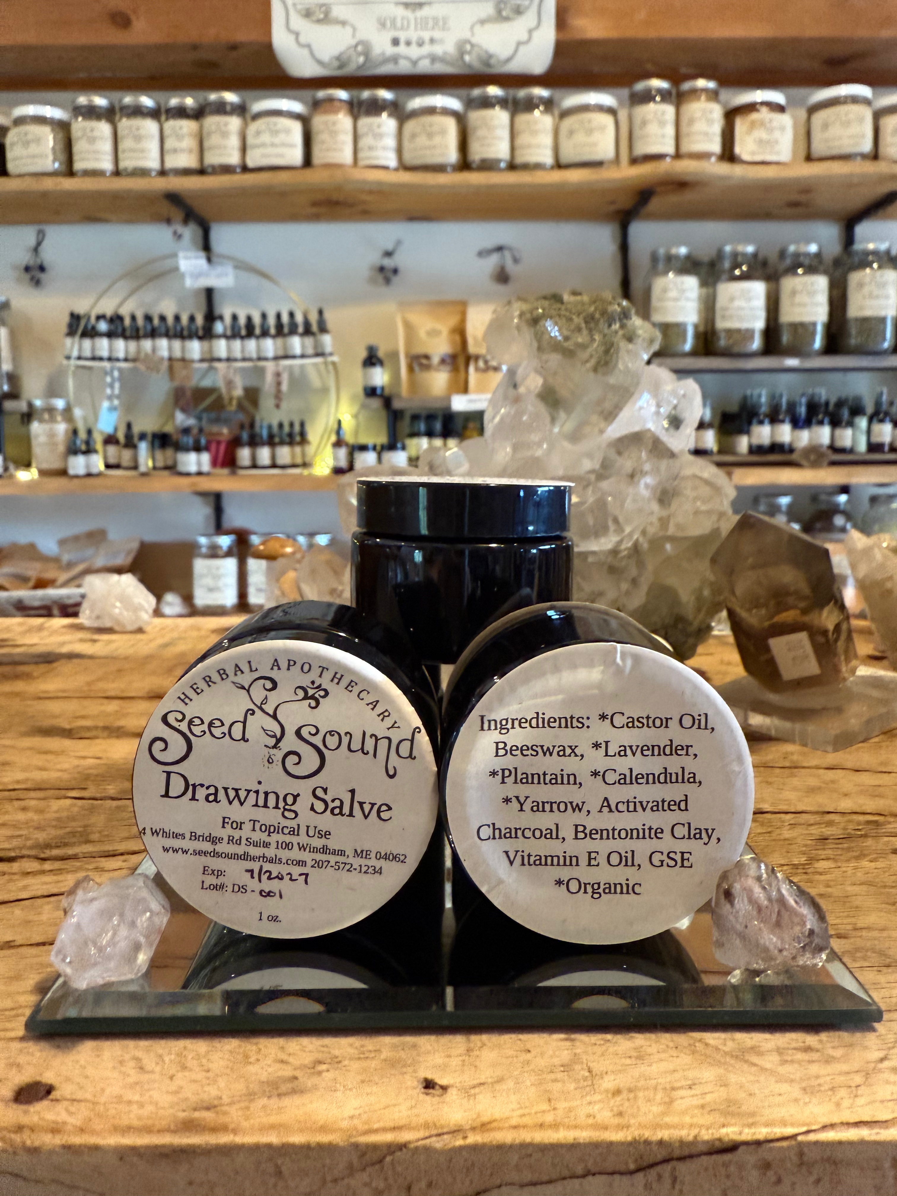 Our Drawing Salve is a topical blend of Castor Oil, Beeswax, Lavender, Plantain, Calendula, Yarrow, Activated Charcoal, Bentonite Clay, Vitamin E Oil, and Grapefruit Seed Extract. This salve helps support the skin’s natural ability to draw out splinters, bites, and impurities.